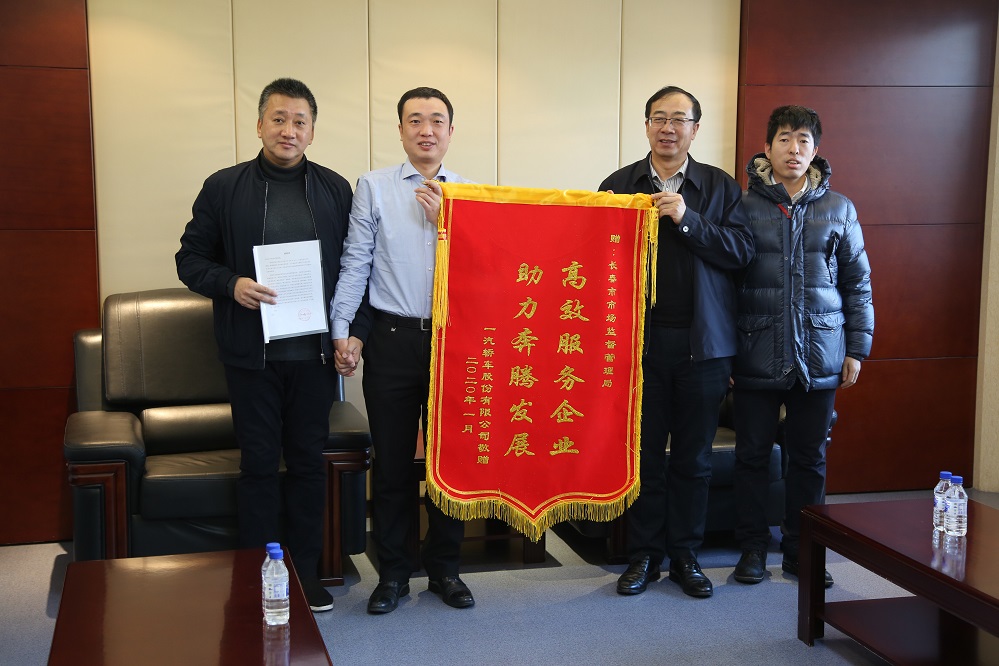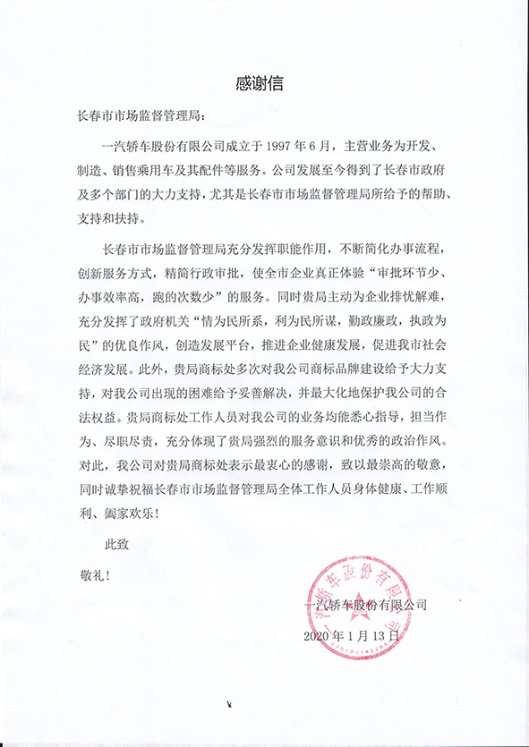 1月16日,一汽轿车综合管理部舒博部长一行,为市场监管局送去锦旗和感谢信。感谢市场监管局为企业发展给予的帮助和支持,特别是在其商标品牌建设及保护方面给予的大力支持表示感谢。